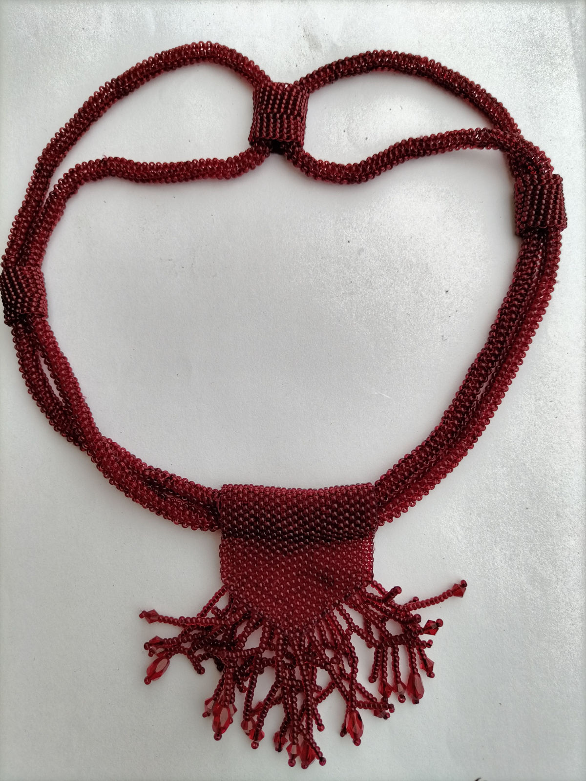 Это колье получилось действительно случайно. В интернете я увидела красивое колье в виде толстой косы, мастер писала, что такое можно сделать только из жгута, сплетенного иглой. И жгут нужен был длинный, больше 2 м. Но я была полна энтузиазма и решила плести. Сплела жгут около метра и выдохлась. Но и распускать работу не хотелось. Начала думать куда эту недоделку пристроить. Соединила концы, сложила жгут в два раза и сплела подвеску с бусинами. И неожиданно мне понравилось, и не только мне. Пару раз меня даже на улице спрашивали, где я такое взяла. Сплела повтор в таком же цвете подруге, и для себя в сером цвете.