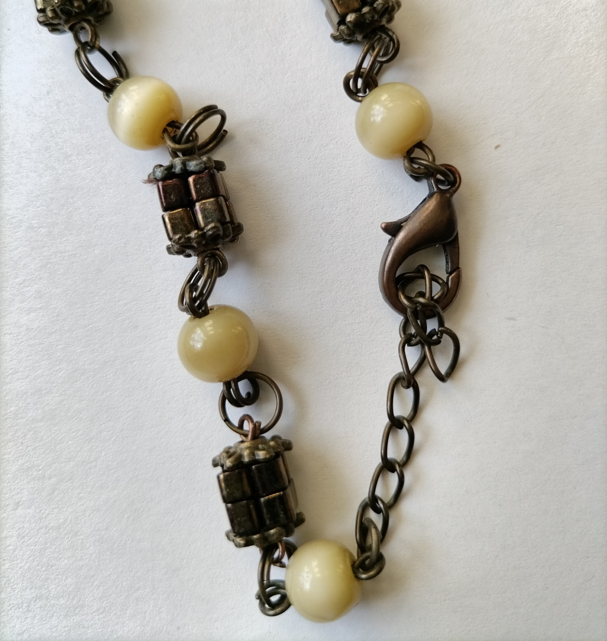 Пока обшивала кулоны кубиками тохо у меня появилась идея как использовать их все сразу — я решила сделать из них бусины. Делала достаточно толстой нитью, проходила несколько раз. Потом пин, шапочка и мне понравился результат. Наделала бусин из всех кубиков, что у меня были. Даже тех, что немного с дефектами ( меньше чем остальные, чуть скошен край). В бусинах под шапочками это не видно. Но для цепочки их было мало, поэтому разбавила простыми бусинками, ну а уже потом для этой цепочки сделала кулон.Бусина ближе