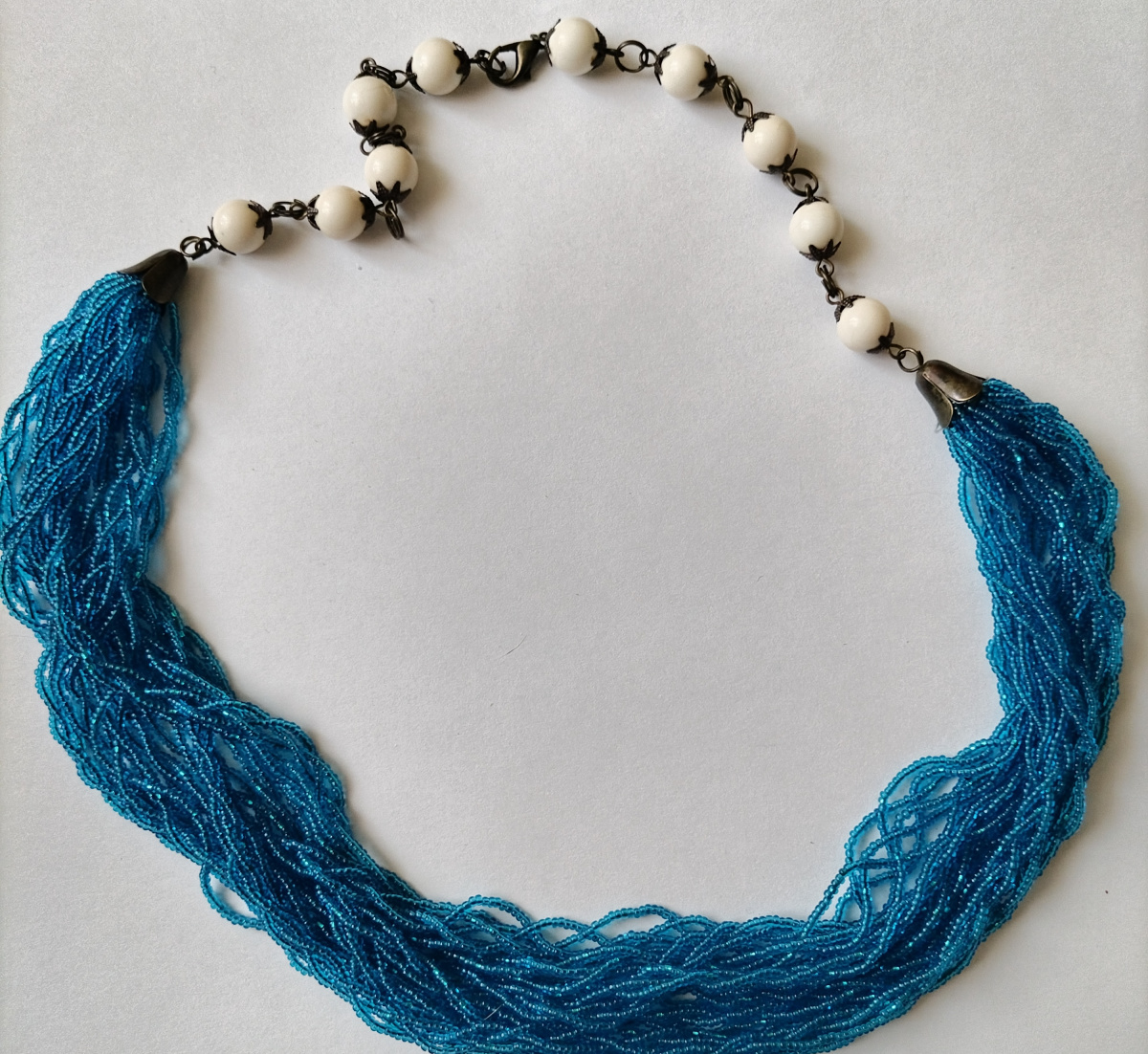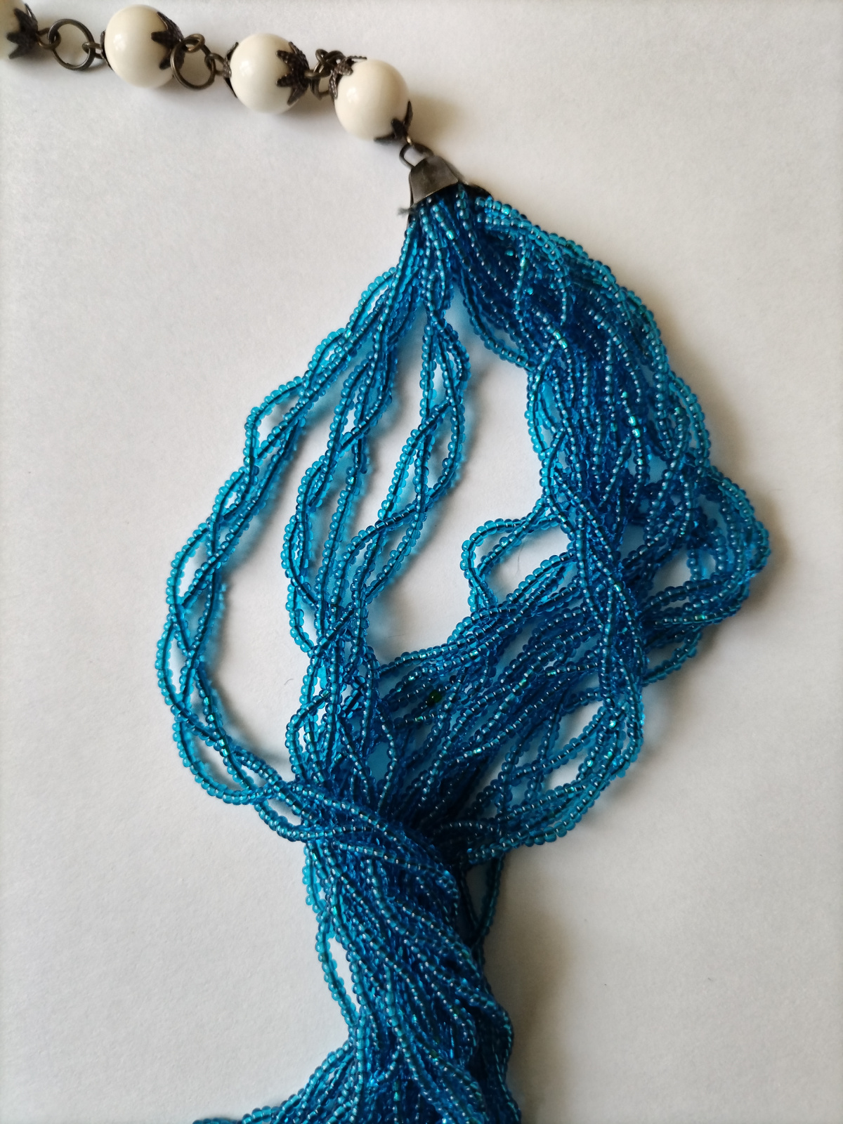 Вторые бусы делала из бисера 12- го размера. Поскольку бисер мелкий, то боялась, что бусы будут дохленькими. Поэтому низки делала не очень длинными и заплела в рыхлые косички.