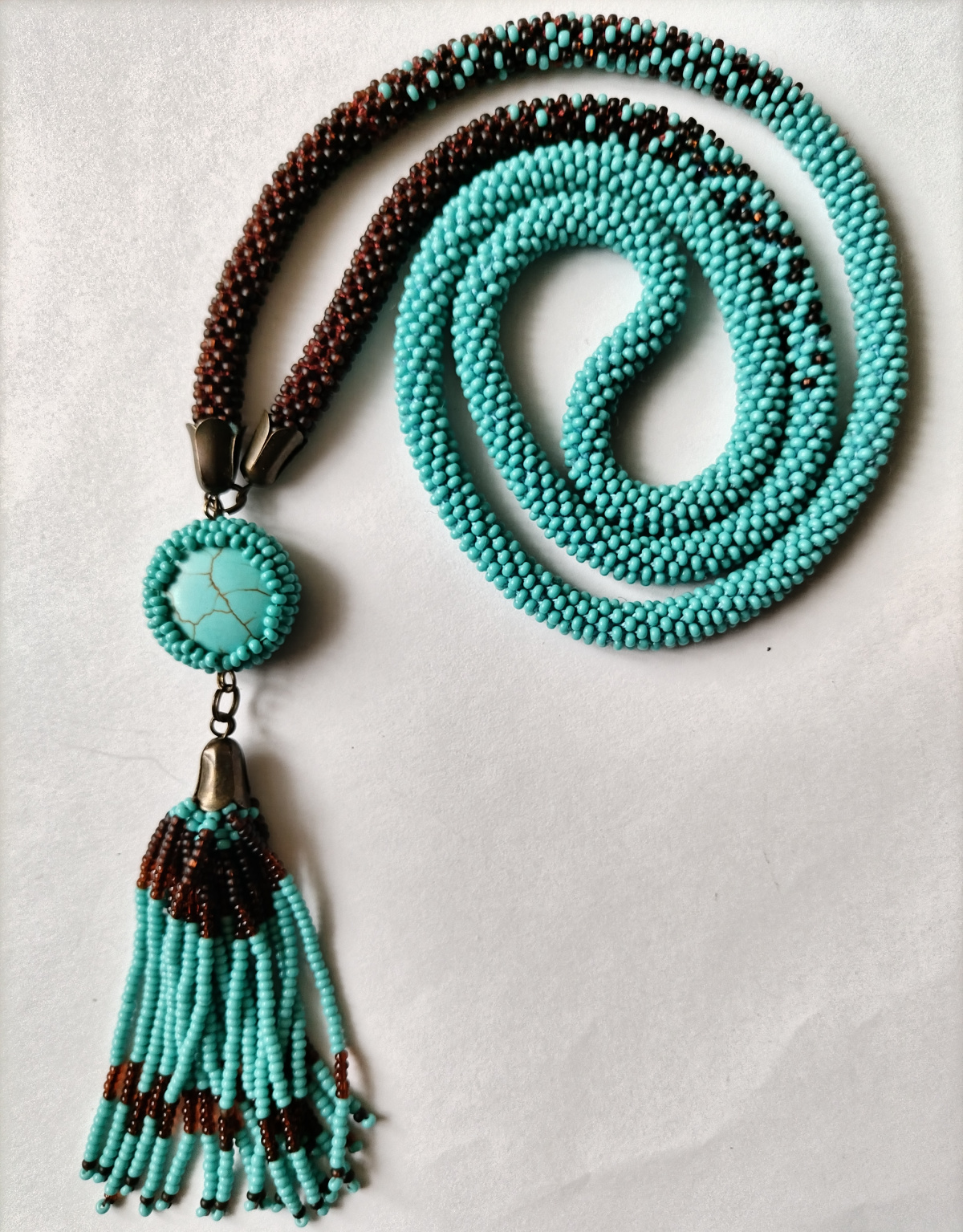 Несмотря на свой простой вид, и кулончик и сотуар хорошо смотрятся на коричневом льняном платье.
