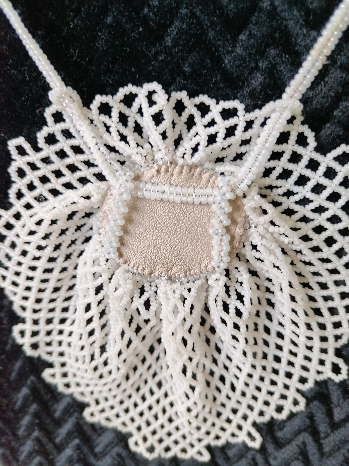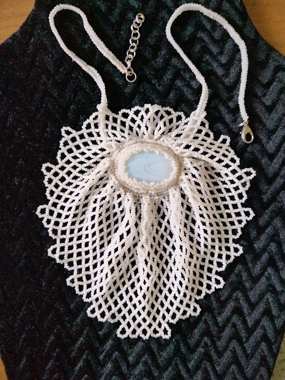 Свое первое жабо я сделала из чеха №10. Иногда носила и даже получала комплименты, но что-то мне в нем не нравилось. А что, не понимала, пока муж не сказал:«Что ты этот блинец на шею себе вешаешь? » Размер, мне не нравился размер жабо и то, что оно образовывало мало складок, было достаточно плоским. Поэтому новое жабо я сделала из бисера №12. Конечно оно стало меньше (14 см в длину) и складки лежат лучше. Держится на тонкой ленточке, так как планировала носить под рубашку и не хотела, чтобы из под воротника было что-то видно.