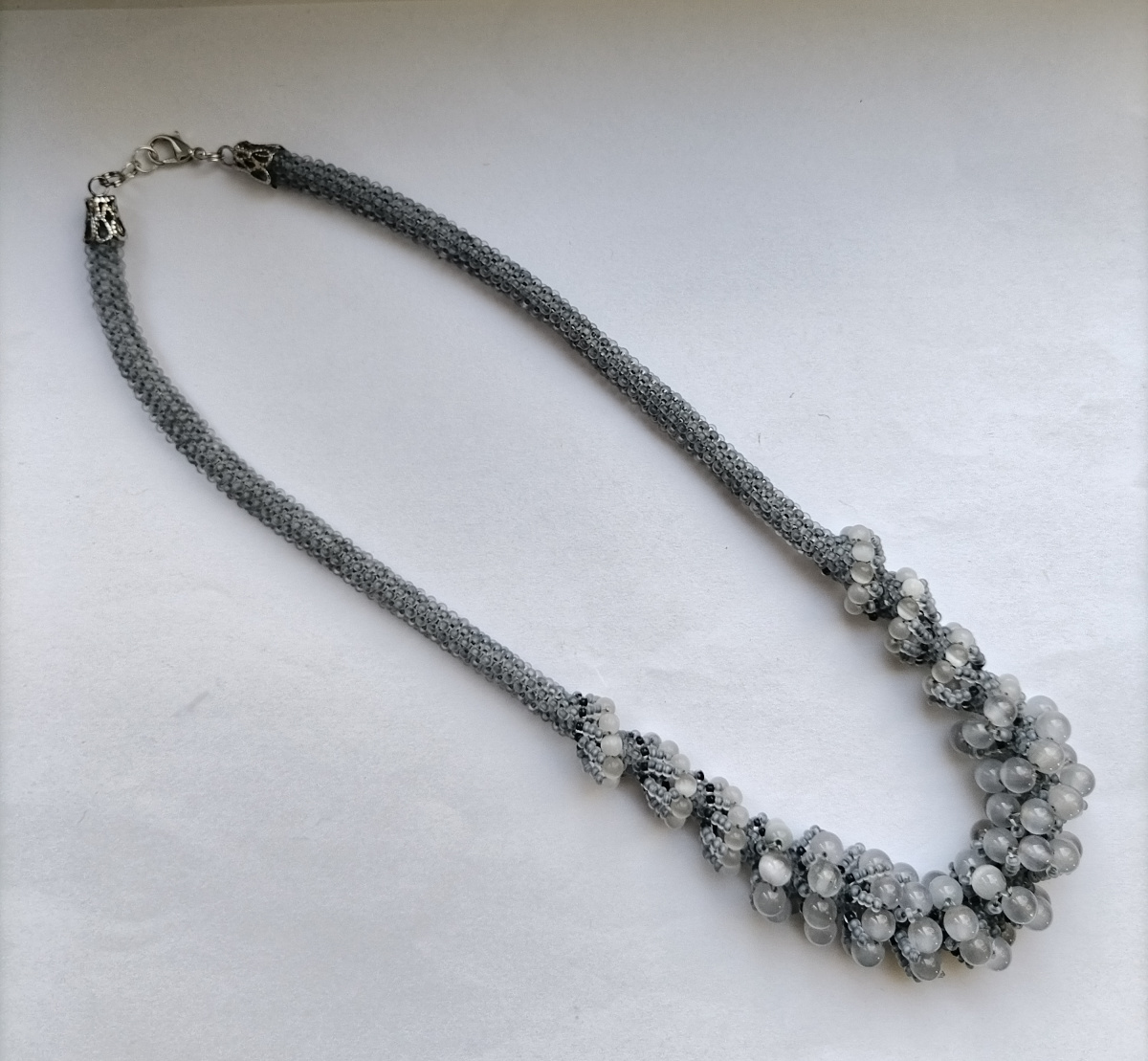 Одна сторона из матового бисера, другая из блестящего. И один и второй жгутик хорошо подходят под одежду офисного стиля. Вариант на лето белого цвета.