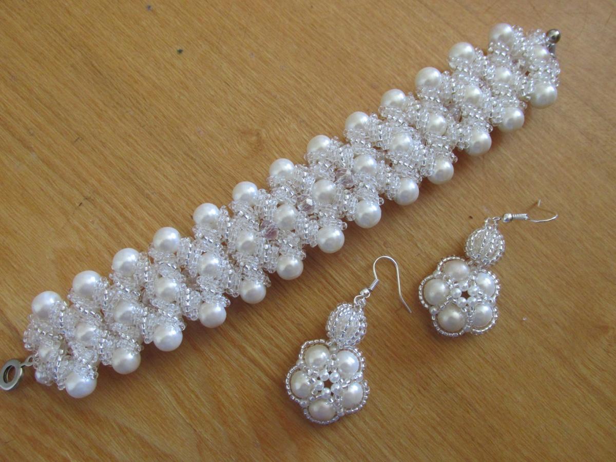 когда-то давно попросили из нитки жемчуга что-нибудь переделать, сделала «Юбилейное» (уже не первое и поэтому даже в альбом не помещала). А сейчас та же заказчица попросила переделать браслет. Браслет был из бусин, плетеный в крестик, широкий и с шатонами, и цапами она позацепляла все платья и вот попросила переделать под то колье, ну и серьги заодно. Вот весь комплект