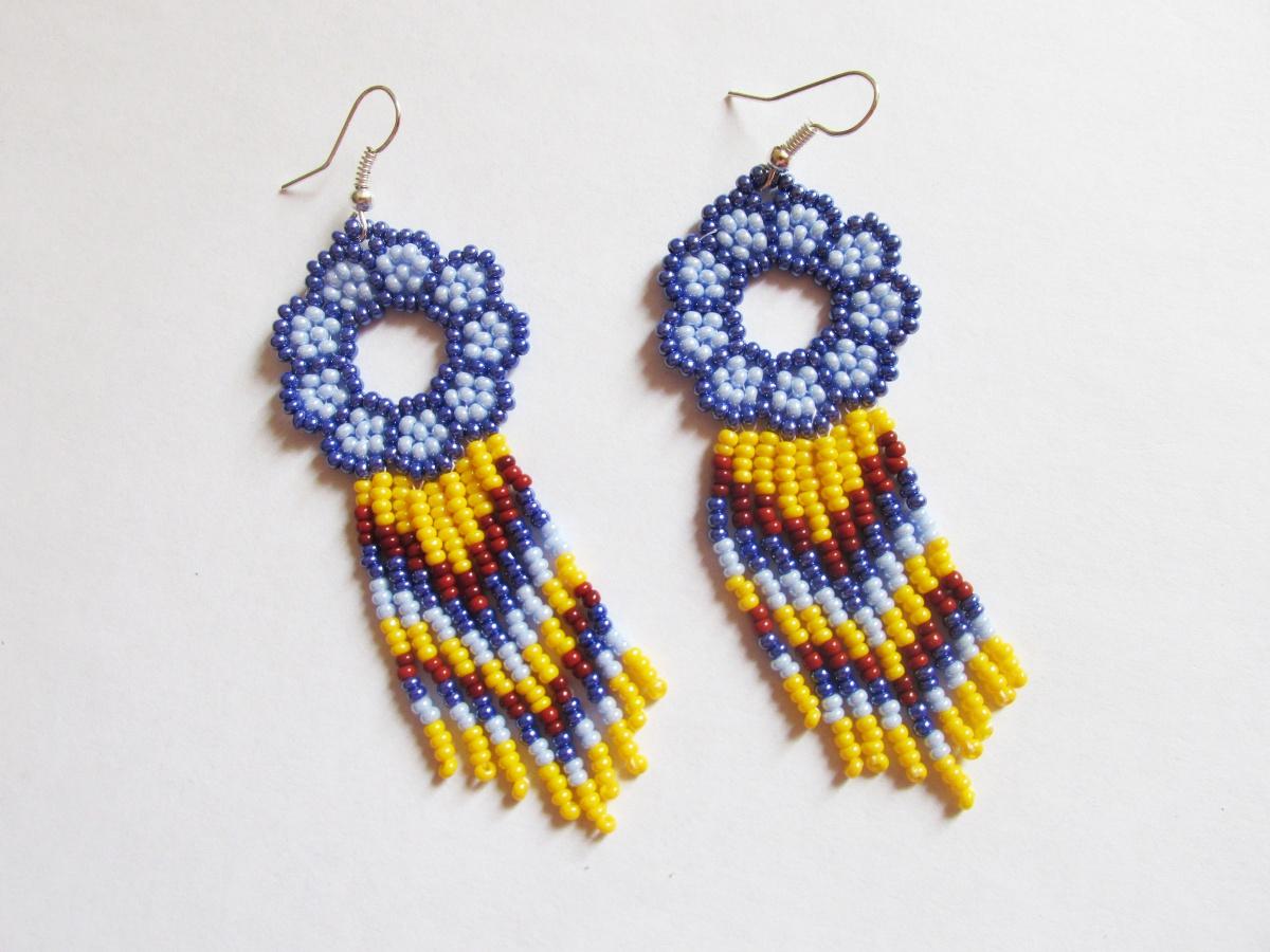 как вы знаете, много жгутов у меня набирает мама. К лету я попросила ее набрать несколько браслетиков. 2 уже есть в альбоме, это третий. Цвета обычно мама выбирает сама. Этот браслетик получился совсем уж яркий и веселый, такой индейский. Решила сделать к нему серьги по мотивам работ индейцев племени Уичоль