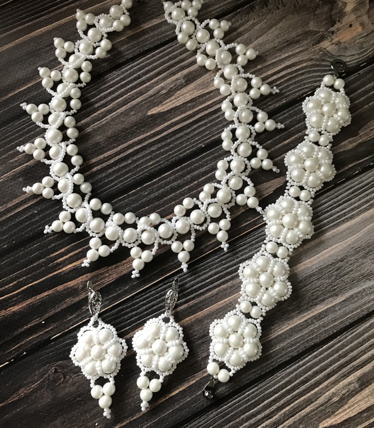 Комплект сделан на заказ, это повтор, такой уже делала. Здесь бусины очень красивые, белоснежные и с интересным эффектом- вроде матовые, но как будто внутреннее свечение )