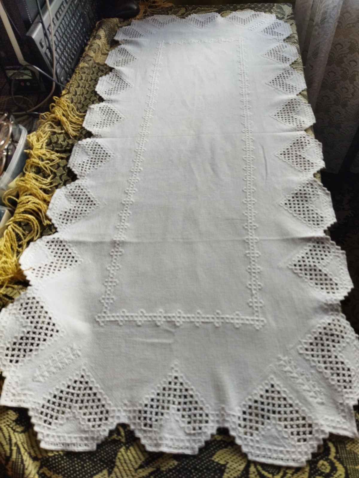 Помню куда-то ездила и вот на вокзале в ларьке увидела журнал с этой салфеткой и сразу его купила (там было и кроме её много интересного). Долго делала, но ни разу не пожалела что взялась за эту работу. Размер её 109 х47 см, все делала вручную.