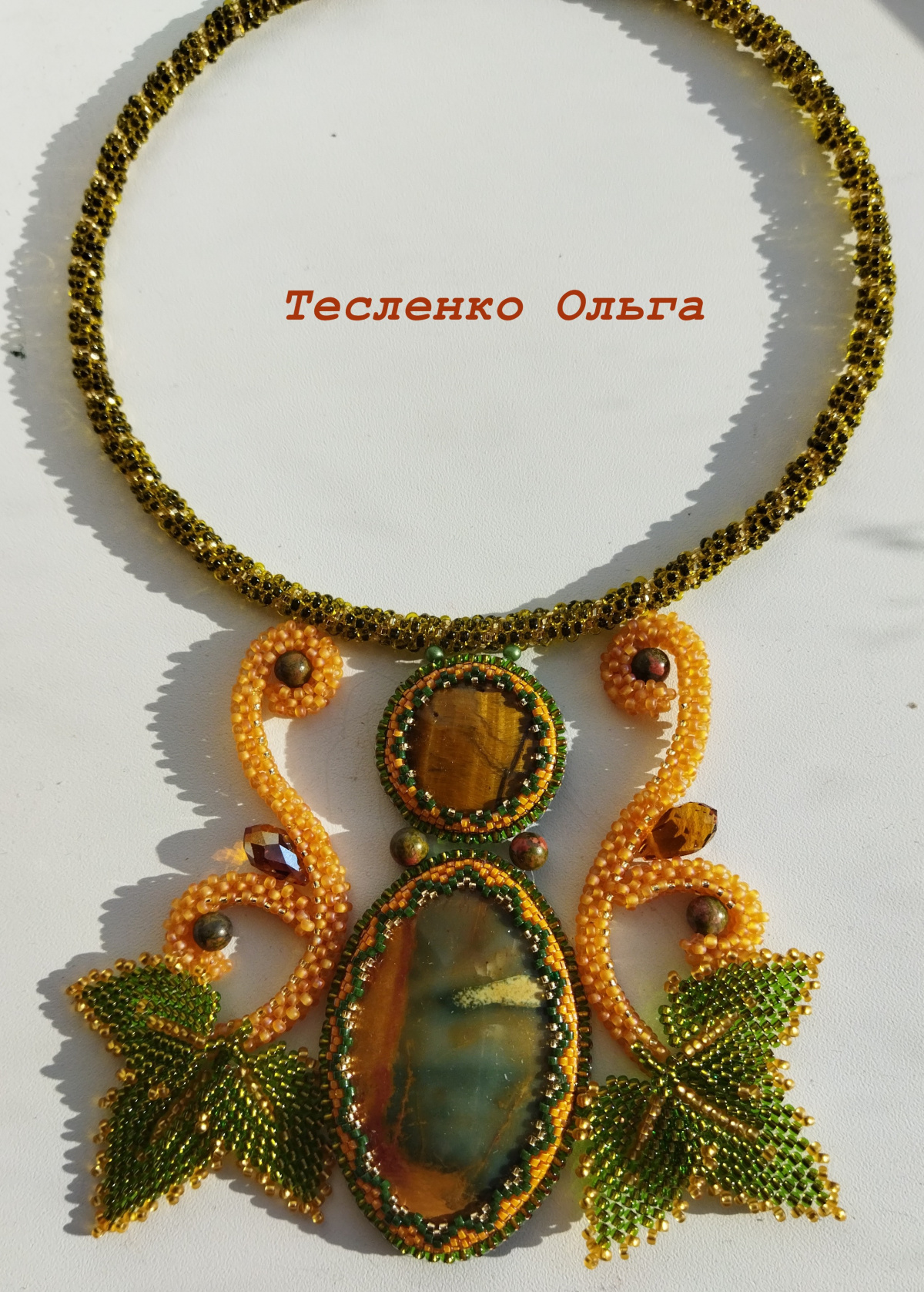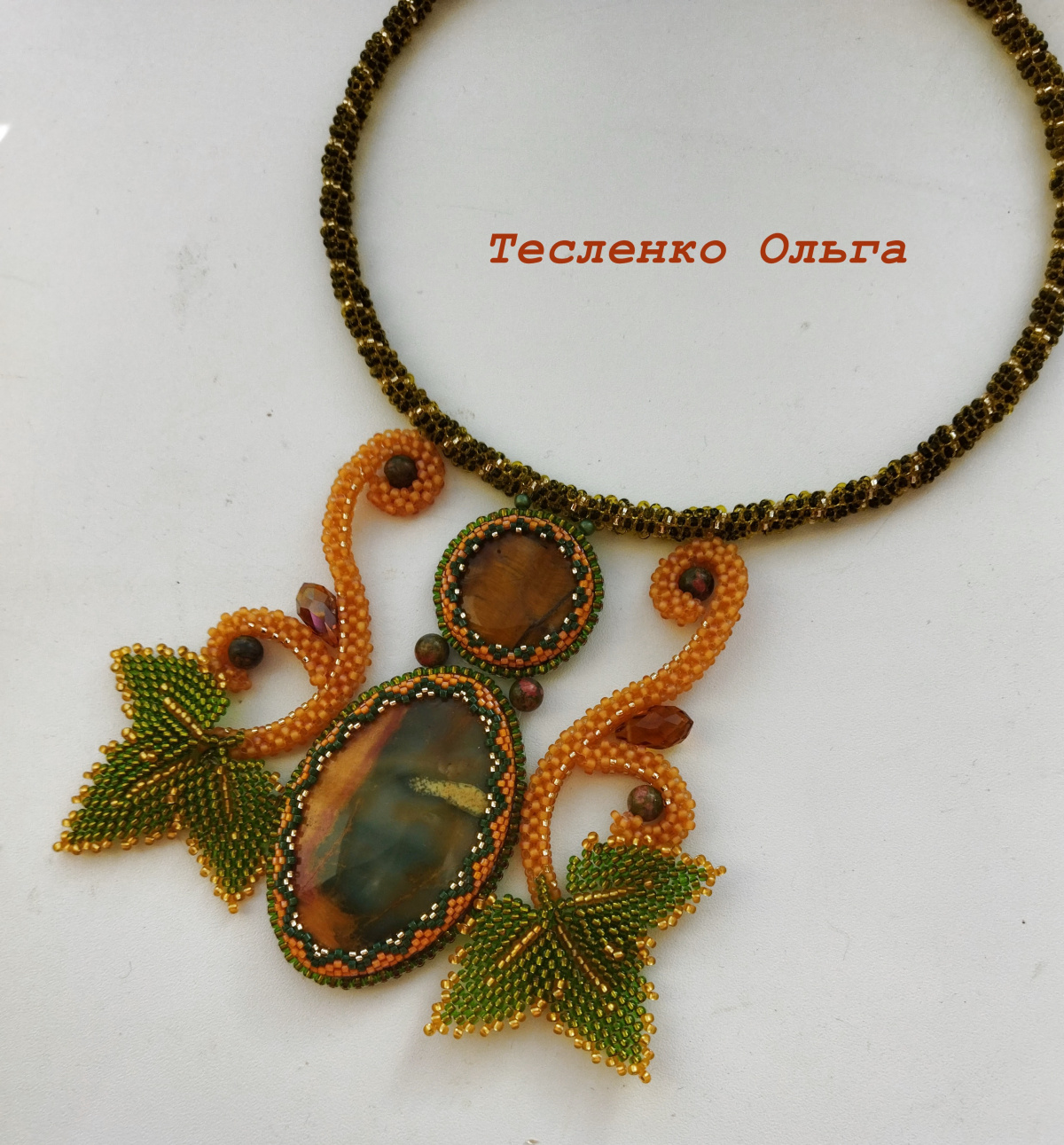 Это колье делала уже зная какое оно будет во всех красках. Камушек не очень красивый и я хотела его оформить так чтоб он заиграл. И мне кажется что это у меня получилось. Он уже уехал в Москву, его взяли на подарок.