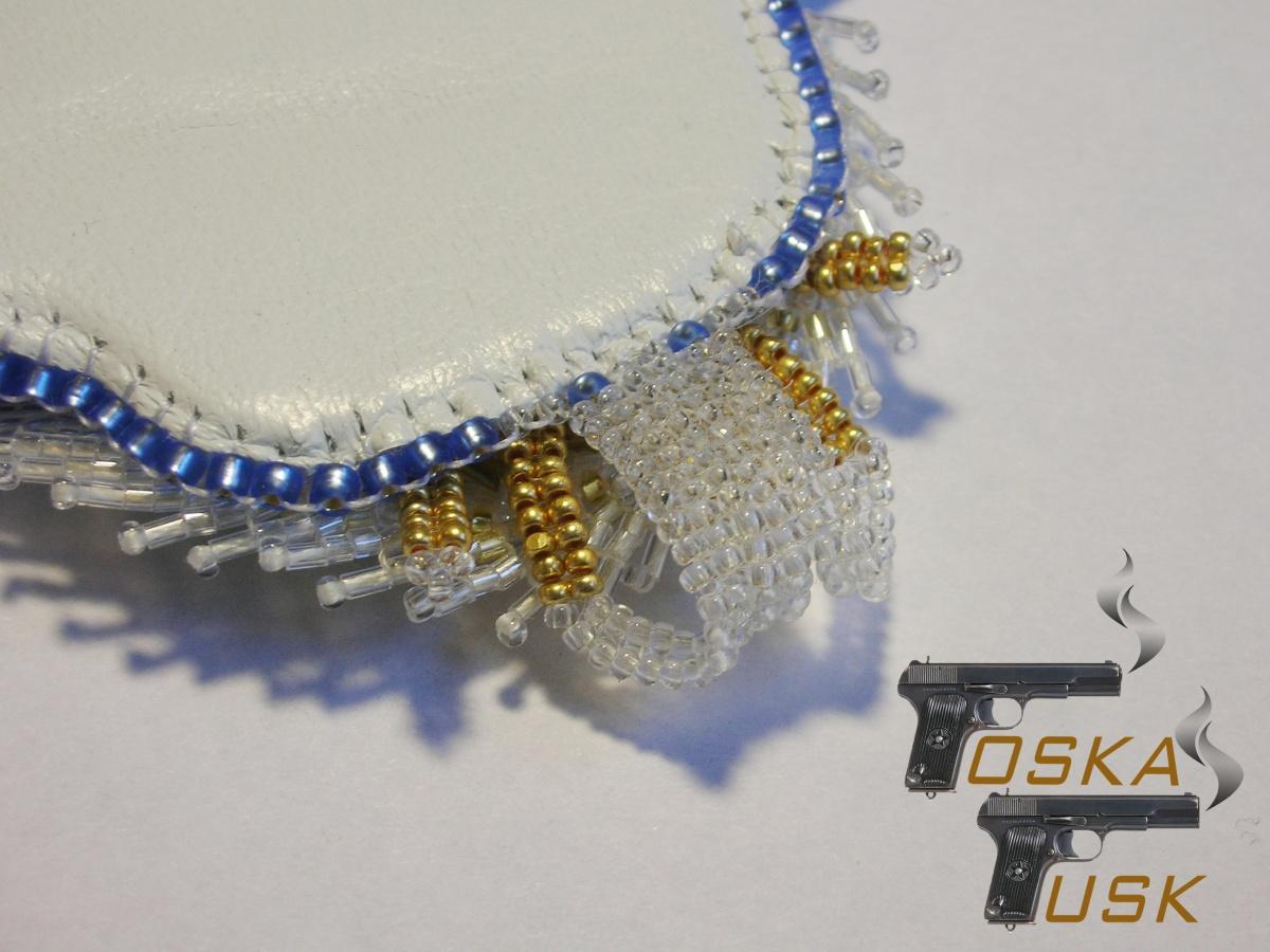 После вышивки и пришивания всех элементов, выяснилось, что камень, не смотря на свою тонкость и изысканность, всё же слегка перевешивает, перетягивает, так сказать, одеяло на себя, и весь кулон немного скособочивается. Вот где-то там внутри (внизу слева) вмурован в слои картона десятирублёвик: