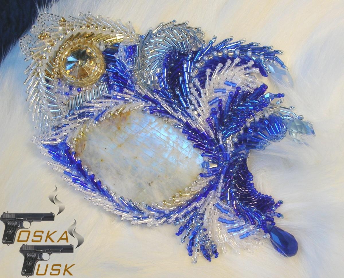Кабошон думала пришивать мозаикой, но, гуляя по бисерным сайтам в обычном порядке, неожиданно обнаружила, что камни можно оплетать и петербургской цепочкой, в том числе. Эврика! Так и поступим. И чего я сокрушалась, что он тонкий. Да как раз такой как надо для мелкого бисера. Вот он, красавчик, затмевает всё вокруг.