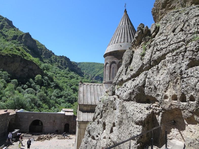 Доехали до монастыря Гегард. Из вики: «Более полное название — Гегардава́нк (арм. Գեղարդավանք, [geghárdavánkh]), дословно — «Монастырь копья». Название монастырского комплекса происходит от копья Лонгина, которым пронзили тело Иисуса Христа на Кресте, и, как утверждается, привезённого в Армению апостолом Фаддеем в числе многих других реликвий. Сейчас копьё выставлено в музее Эчмиадзина»
