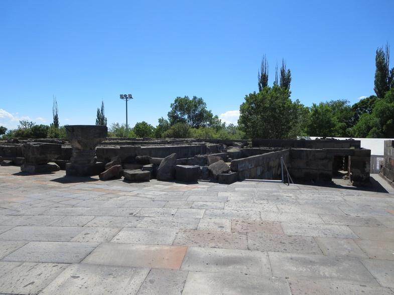 И вот мы приехали в Звартноц (IIIв) Из вики: «Звартно́ц (арм. Զվարթնոց, храм Бдящих Сил, храм Небесных Ангелов) — храм раннесредневековой армянской архитектуры, расположен близ Еревана и Вагаршапата (Эчмиадзина)… Руины Звартноца открыты раскопками в 1901—1907 гг. К настоящему времени почти целиком реконструирован первый ярус. Храм, по реконструкции Т.Тораманяна, представлял собой круглое трехъярусное купольное сооружение (диаметр нижнего яруса 35,75 м). В круг основания вписан крест, три крыла которого образованы по полукругу 6 колоннами, а восточное крыло — апсида — было глухой стеной, которую покрывали мозаики и фрески. У алтарной апсиды — высокое возвышение, с одной стороны — амвон, впереди — крестильная купель. Сзади к апсиде примыкало квадратное помещение, видимо, ризница, из которой поднимались по лестнице в коридор, шедший по верху первого яруса»