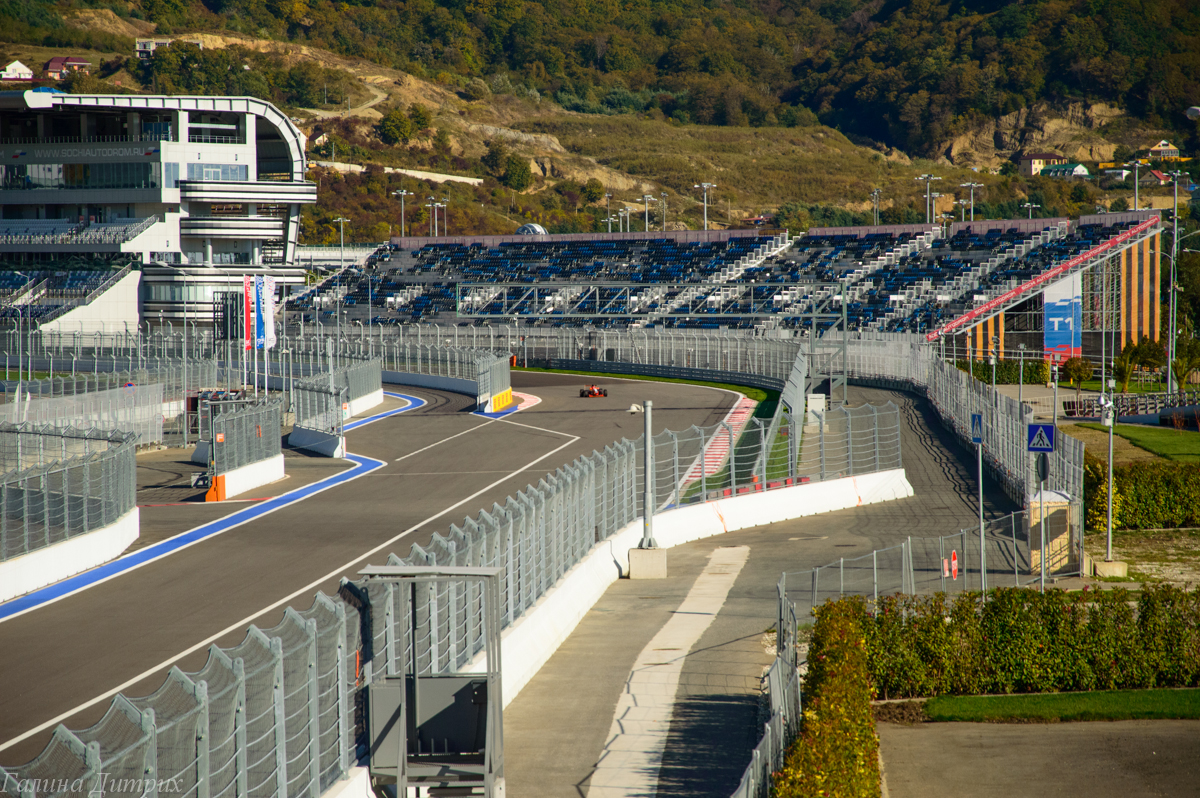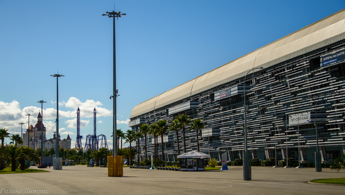 Мимо всей этой красоты ведет дорога к морю. Но мы к морю сейчас не пойдем, а свернем за Сочи-парк с аттракционами и сразу попадем в Олимпийский парк. Это «изнанка» главной трибуны «Формулы-1»: