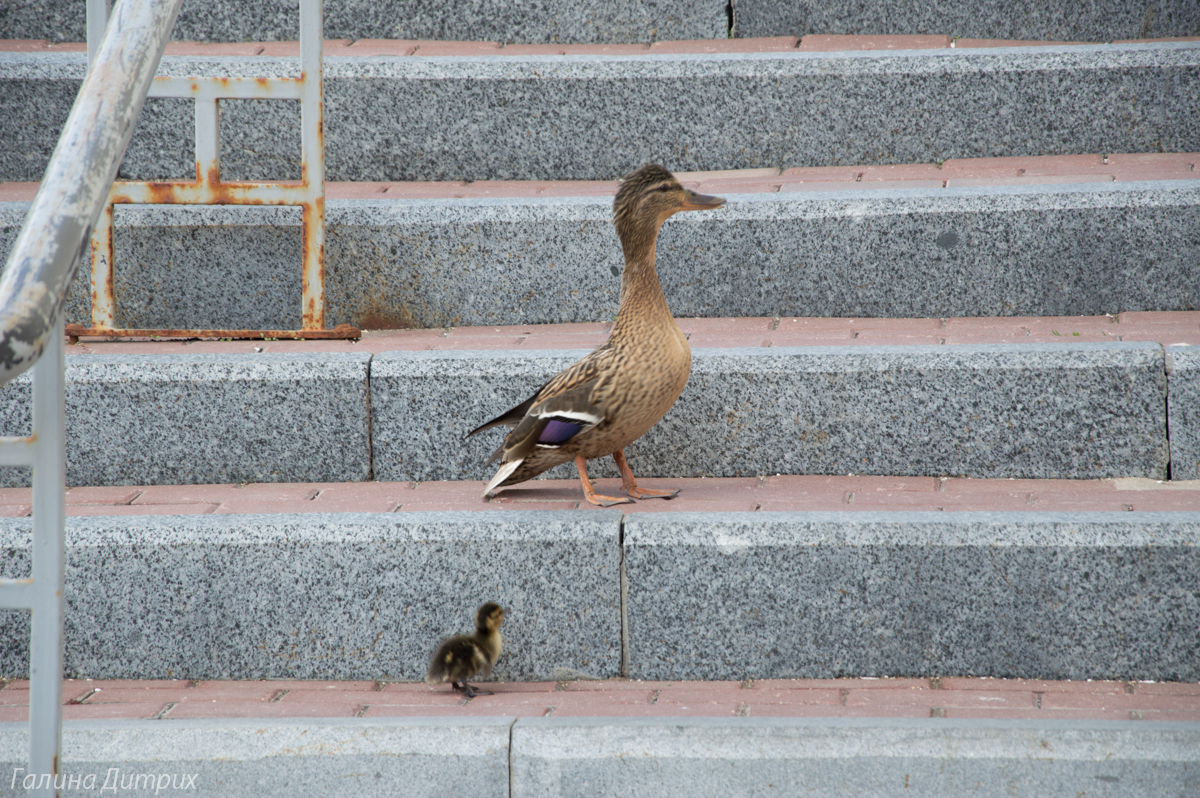 На территории Кремля встретили маму-уточку и утенка, который не с первого раза забирался на каждую ступеньку лесенки, но она терпеливо ждала