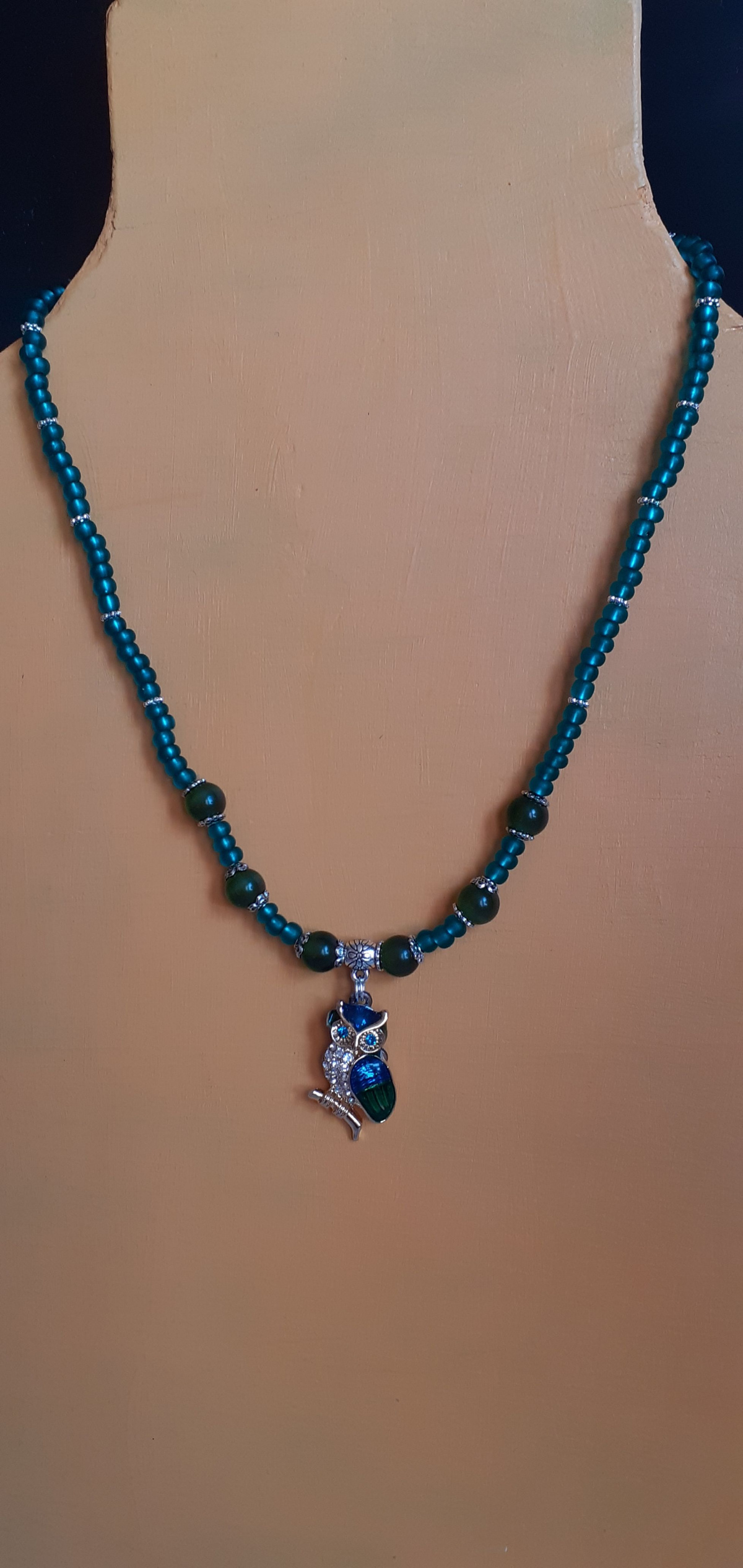 Собралась в гости в Краснодарский край, а так как там жарко бывает и крупные бусики там не в ходу, сделала пока два чокера. может быть оденут летом. Один назвала: Филин сел на ветку дуба. Здесь стекло-кошачий глаз, всего шесть бусинок и бисер №6