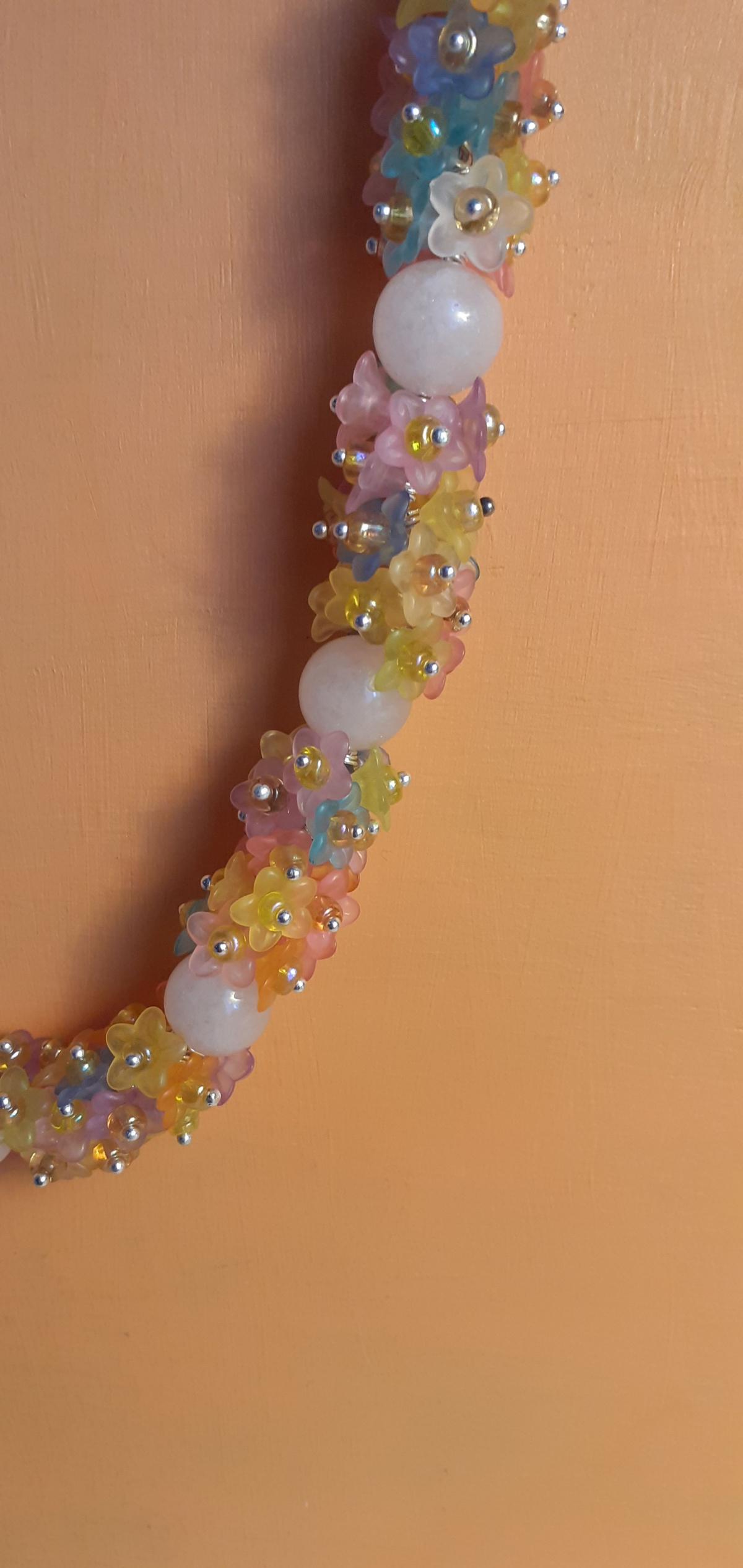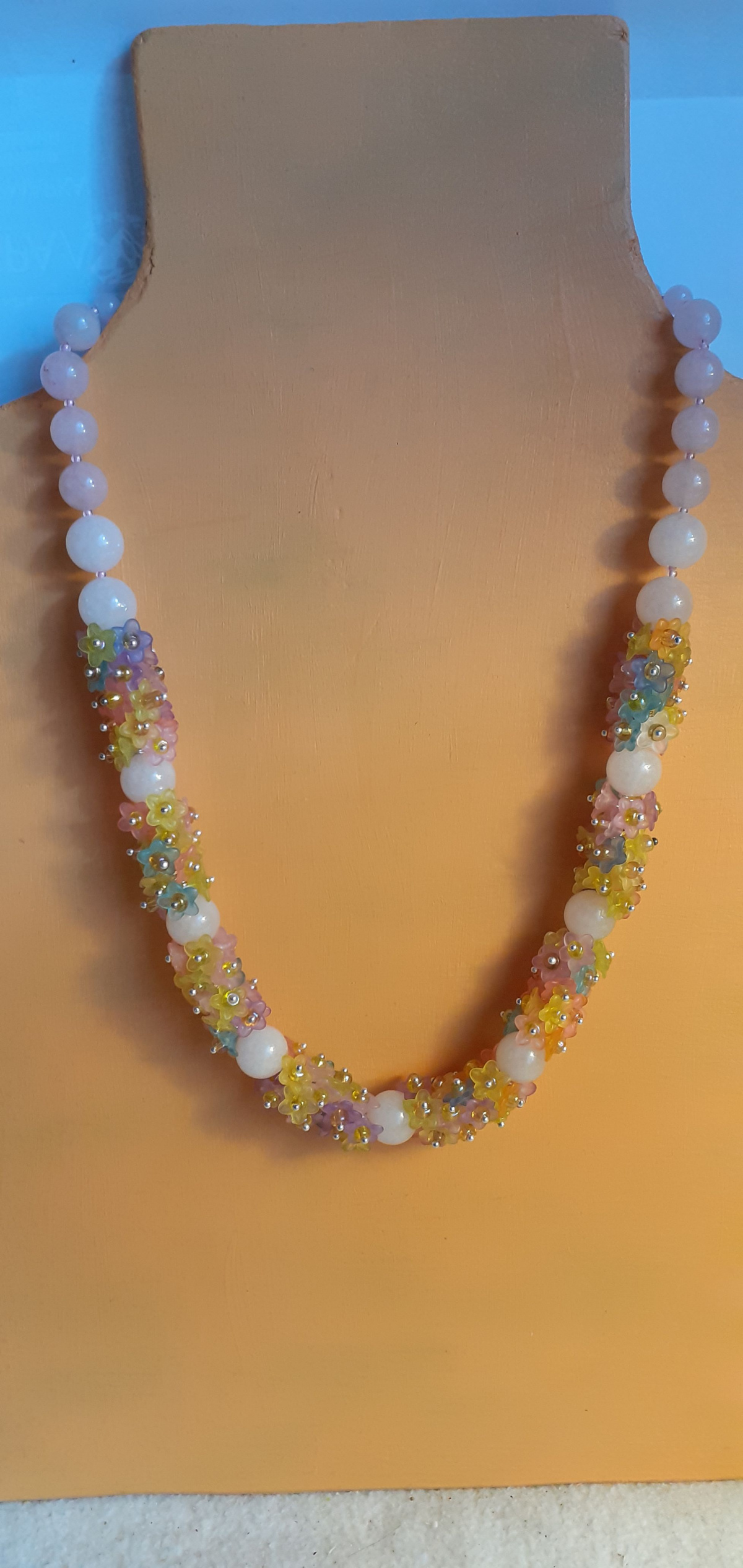 И еще одни загородные весёленькие бусики. За городом накрутила цветочки на пины. А сегодня приехала домой и собрала окончательно. Сзади бусины розового кварца. Не захотела набирать сзади цветочки. Думаю, что будет не комфортно носить. Лепестки цветочков достаточно угловатые и будут колоть кожу