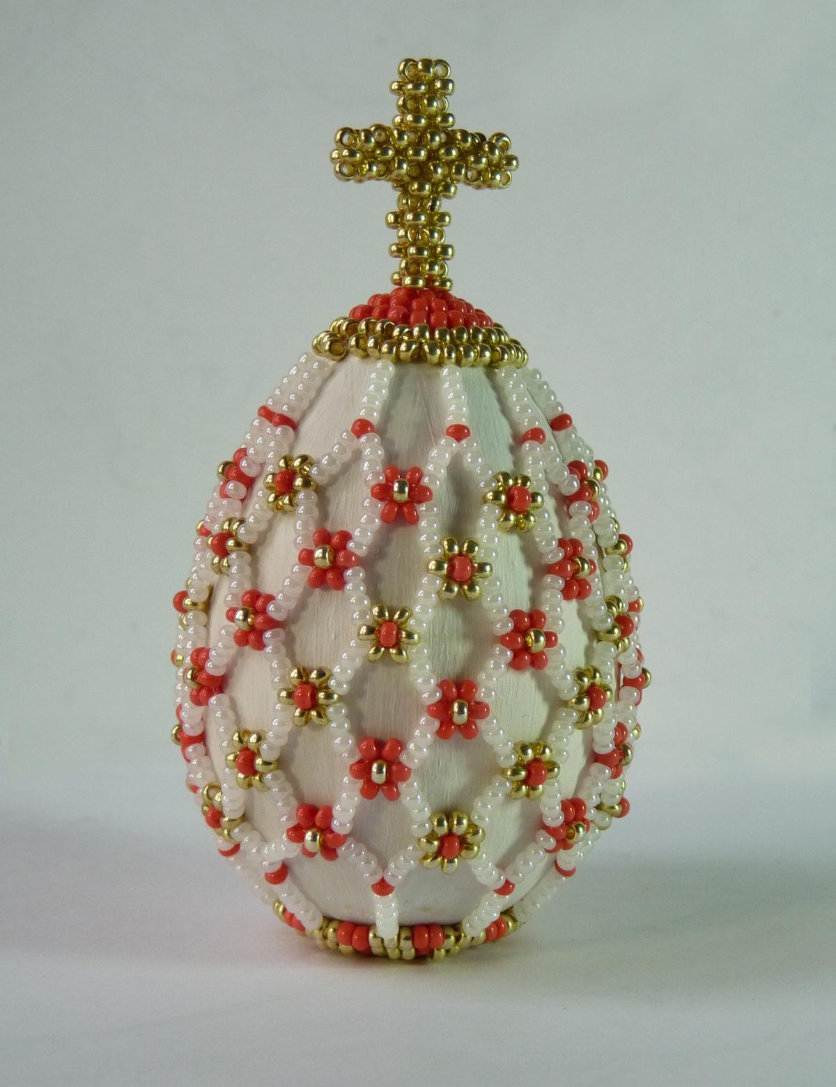 Покажу свои прежние работы. Первое сама выдумывала плела по «ходу пьесы». А второе и третье брала за основу яйцо Марины Ляукиной. По её урокам я училась делать пасхальные яйца. Золотой бисер (чешский причем ) увы со временем почернел-потемнел